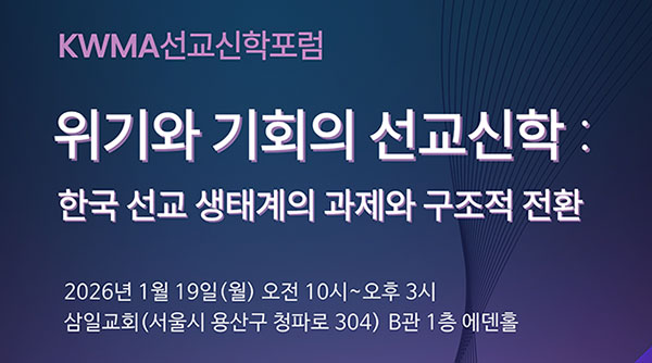연중기획 : 동반자선교로 가는 길동반자 선교 필연적으로 가야 할 길, 지금이 전환 적기기사 보기“현지인을 주인으로”한교선 & KWMA MOU기사 보기선교의 '대전환기' 필요한 변화는?KWMA 선교신학포럼기사 보기KWMA 제36차 정기총회기사보기남미 COMIBAM 동반자 선교 포럼관련 기사 보기2025 KWMA 10대 뉴스기사 보기 한국세계선교협의회(KWMA)에 오신 것을 환영합니다. KWMA는 주님의 지상명령을 이루기 위한 한국교회의 선교공동체입니다. KWMA 152개 회원 단체 (17개 교단선교부 & 135개 선교단체) KWMA는 한국교회의 건강한 선교 생태계 조성을 위해 일합니다. 공지사항 요르단 소식과 기도제목 [2026-03-05]중동을 위한 긴급 기도[2026-03-04]박태연 선교사님을 위한 긴급 중보기도[2026-01-28]KWMA 사무국 재정간사님을 찾습니다! (마감)[2025-12-08]CBS 디캠프상 수상자 추천 요청의 건(3차, 마감일 연장)[2025-11-02] 보도자료 [26.01.13 기독신문] [연중기획:동반자 선교로 가는 길 1] 동반...[2026-01-23][26.01.20 국민일보] “현지인을 주인으로” 한국 선교, ‘초심’으...[2026-01-21][26.01.21 기독교연합신문] “선교의 ‘대전환기’ … 한국 선교 생...[2026-01-21][26.01.12 데일리굿뉴스] KWMA 제36차 정기총회 개최... 정...[2026-01-16][25.12.19 국민일보] 한국선교사, 현지 교회에 선교 비전 심는 일...[2025-12-24] 사역안내 이주민선교 훈련학교/MMTS가 열립니다[2026-02-11]일본 단기선교여행 지도자 세미나[2026-01-27]GAPP 플랫폼 전략 트레이닝[2026-01-11]KWMA 선교신학포럼 [2026-01-11]2026 총신대학교 선교대학원 신입생 추가 모집[2025-12-23] KWMA 최신 사역 소식 [26.02.19] 강충희 치과의원, ‘선교모범기관’ 인증패 수여한국세계선교협의회(KWMA) 사무총장 강대흥 선교사는 지난 2월 19일(목) 오후 6시, 서울 구로동에 위치한 강충희 치과의원을 방문하여 강충희 원장에게 ‘KWMA 선교모범기관’ 인증패를 수여하였습니다.이번 인증패 수여는 강충희 치과의원이 지난 20여 년간 무료 진료와 진료비 감면 등을 통해 수많은 선교사를 헌신적으로 섬겨온 공로를 기리기 위해 마련되었습니...[26.02.04] 시라큐스 한인교회 지용주 목사, ‘선교모범교회’ 인증패 수여한국세계선교협의회(KWMA) 강대흥 사무총장은 지난 2월 4일(수) 오후 2시, KWMA 회의실에서 미국 시라큐스 한인교회(Korean Church of Syracuse)의 지용주 목사에게 '선교모범교회 인증패'를 수여하며 그간의 헌신적인 사역에 깊은 감사를 전했습니다.시라큐스 한인교회는 지난 20여 년간 컴퓨터 교실, 로다이 서머캠프 등을 통해 전 세계 ...[26.02.04] 국민일보 대담; '현지인 중심의 동반자 선교' 패러다임 전환 논의지난 2월 4일(수) 오전 국민일보 본사 대회의실에서 송태근 목사(삼일교회), 김후식 목사(예장통합 총회세계선교부장), KWMA 강대흥 사무총장이 패널로 참석하여 ‘현지인 중심의 동반자 선교’ 패러다임 전환에 관한 대담이 진행되었습니다.논의의 핵심은 '돈과 힘'을 앞세운 선교 방식에 대한 자성에 있었습니다. 송태근 목사는 "선교지는 시혜의 대상이 아니며, ...[26.02.03] '북한 교회 회복을 위한 7원칙' 심층 논의KWMA는 오늘 세미나실에서 북한 선교 전문가 7인을 초청하여 '통일 이후 북한 교회 회복을 위한 7원칙(안)'에 대한 심도 있는 논의를 진행했다. 이날 모임은 KWMA가 제안한 북한 교회 회복을 위한 7원칙을 두고 학계와 전문가들이 모여 자유롭게 의견을 개진하여, 향후 보다 구체적이고 실천적인 로드맵을 수립하기 위해 마련되었다.이날 논의의 핵심이 된 7원...[26.02.02] 중선협 소속 윤상원 목사님 방문중선협 소속 윤상원 목사님이 KWMA를 방문하였습니다.윤목사님은 쿠웨이트 한인연합교회 담임목사로 6년간 사역하면서 단순히 현지 한인 목회에 그치지 않고, 보다 효과적이고 건강한 무슬림 사역 모델을 정립하기 위해 방대한 자료를 수집하고 연구에 매진해 왔습니다.강대흥 사무총장님과의 대담을 통해 그간 연구한 내용을 토대로 효과적인 무슬림 사역에 대한 이야기를 나...[26.01.26] GAPP 플랫폼 트레이닝 세미나 개최기독교한국침례회 해외선교회(FMB) 주관, 한국세계선교협의회(KWMA) 후원, IMB의 적극적 지원으로 2026년 1월 26일부터 27일까지 이틀간 여의도순복음교회 세계선교센터에서 'GAPP 플랫폼 전략 트레이닝' 세미나가 개최되었다. 30여 명의 한국 선교 지도자들과 실무 책임자들이 참석한 이번 세미나는 단순한 기술 교육을 넘어 한국 선교의 구조적 전환을...[26.01.27] IBA 사무총장 유정민 목사 방문2026년 1월 27일, KWMA 협력 기관인 IBA(International Business Alliance) 신임 사무총장 유정민 목사가 인사차 방문하였습니다. IBA는 2007년에 시작된 한국의 대표적인 BAM(Business As Mission, 선교적 기업) 운동 연합체입니다. 비즈니스를 통해 선교적 사명을 실천하는 'BAMer'를 양성하고, 일터...[26.01.23] 찬양사역자 박종호 장로 방문찬양 사역자 박종호 장로님이 KWMA를 방문하였습니다. YWAMer 이면서 선교의 후원자이신 박장로님은 어려운 선교사님들을 도우려는 비전을 갖고 있습니다. 박장로님은 찬양을 통해 KWMA와의 협력을 원하십니다. 박 장로님의 건강과 사역을 위해서 기도해 주시기 바랍니다. 소식 더보기 New Target 2030더보기제23회 한국선교지도자