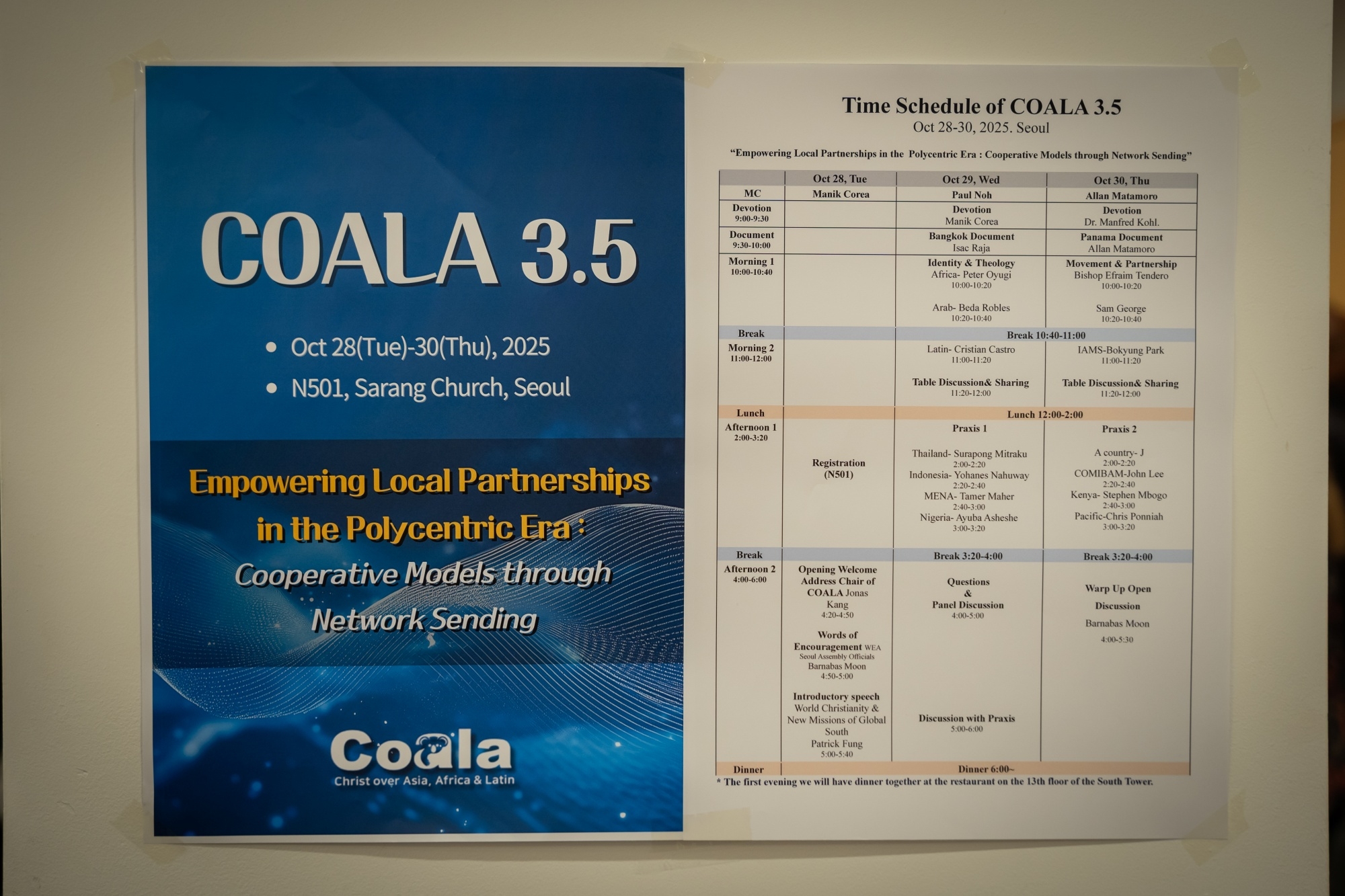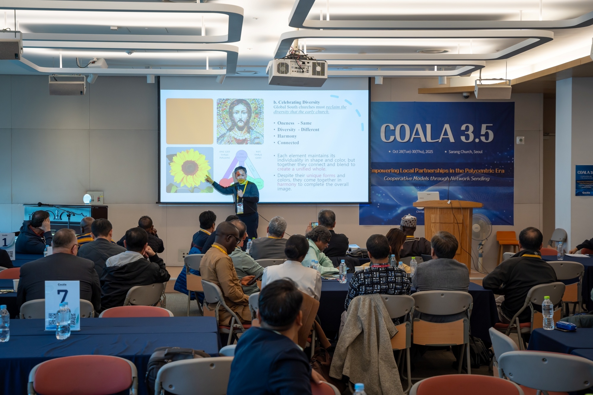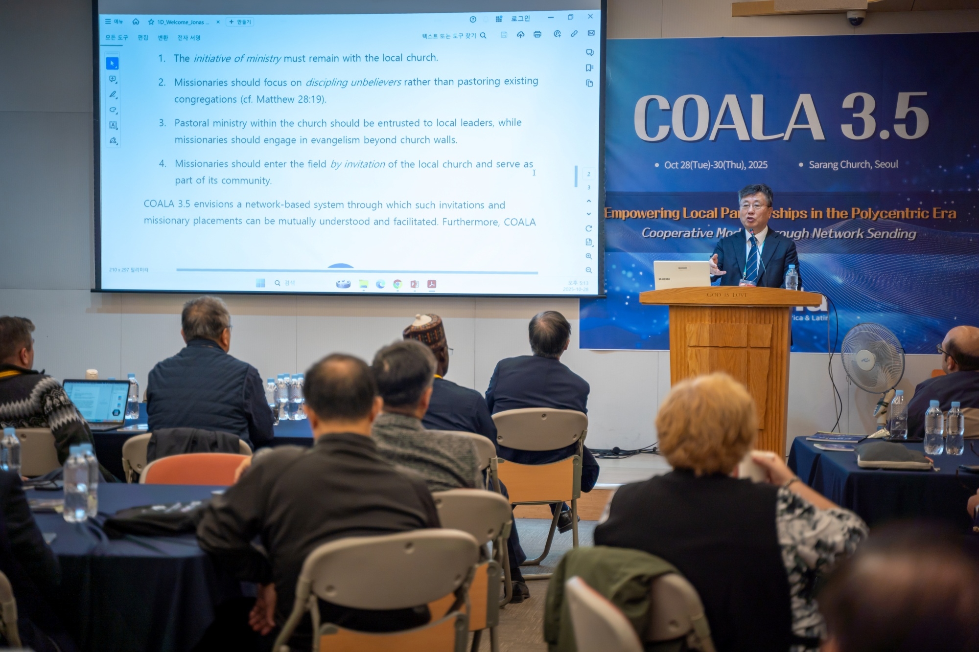 Coala 3.5 대회 2025년 10월 28~30일, 서울 사랑의교회에서 WEA 서울총회와 동시에 COALA 3.5 대회가 열렸다. 22개국 51명이 참여한 가운데 “다중심 시대의 지역 기반 선교협력 강화: 네트워크를 통한 협력 모델(Empowering Local Partnerships in the Polycentric Era)”이라는 주제로, 글로벌 사우스 교회들이 주체가 되어 선교적 협력을 강화하는 방향을 대회의 중심에 두었다. 이에 따라 ‘선교사가 현지교회의 초청을 기반으로 파송되고, 현지 지도력을 인정하고 강화하며, 현지교회가 실제로 필요로 하는 부분을 채워주는 선교’ 등이 주요 의제로 다뤄졌다. 이번 COALA 3.5는 한국교회가 글로벌 사우스와 함께 새로운 선교협력 모델을 모색하는 중요한 자리였으며, 선교 패러다임의 전환을 실제로 경험하는 의미 있는 모임이 되었다. 이번 대회에서는 글로벌 사우스 중심의 실제적 협력 모델이 구체화되는 의미 있는 사건들이 이어졌다. 특히 이집트 카이로의 카사라 두바라 교회와 COMIBAM(라틴 아메리카 선교협의회) 간의 공식적인 선교협력 협정서(MOU)가 체결되었다. 이는 지난 파나마 대회에서 IMA(인도 선교협의회)와 COMIBAM이 맺은 협력 이후 두 번째로 이루어진 남반구 간 협정으로, 앞으로 South-to-South 협력이 더욱 빠르게 확산될 중요한 신호가 되었다. 이번 대회에는 WEA 서울총회를 위해 한국을 방문한 인사 중 독일 선교협의회 대표 볼프강(Wolfgang) 목사를 비롯한 약 20명의 글로벌 노스(북반구) 지도자들이 COALA 모임을 찾아와 협력 가능성을 타진했다. 이들은 다중심(polycentric) 시대의 선교가 더 이상 한쪽 중심에서 움직이지 않으며, COALA 운동이 글로벌 선교의 흐름을 실제로 바꾸어 가는 중요한 플랫폼이 되고 있다고 평가하며, 향후 협력과 동반 참여를 희망했다. 이번 COALA 3.5 대회는 이와 같은 협정 체결과 방문·대화의 장을 통해, 글로벌 사우스 교회들의 연대는 물론 글로벌 노스와의 새로운 차원의 협력까지 열어 가는 전환점이 되는 자리였다.