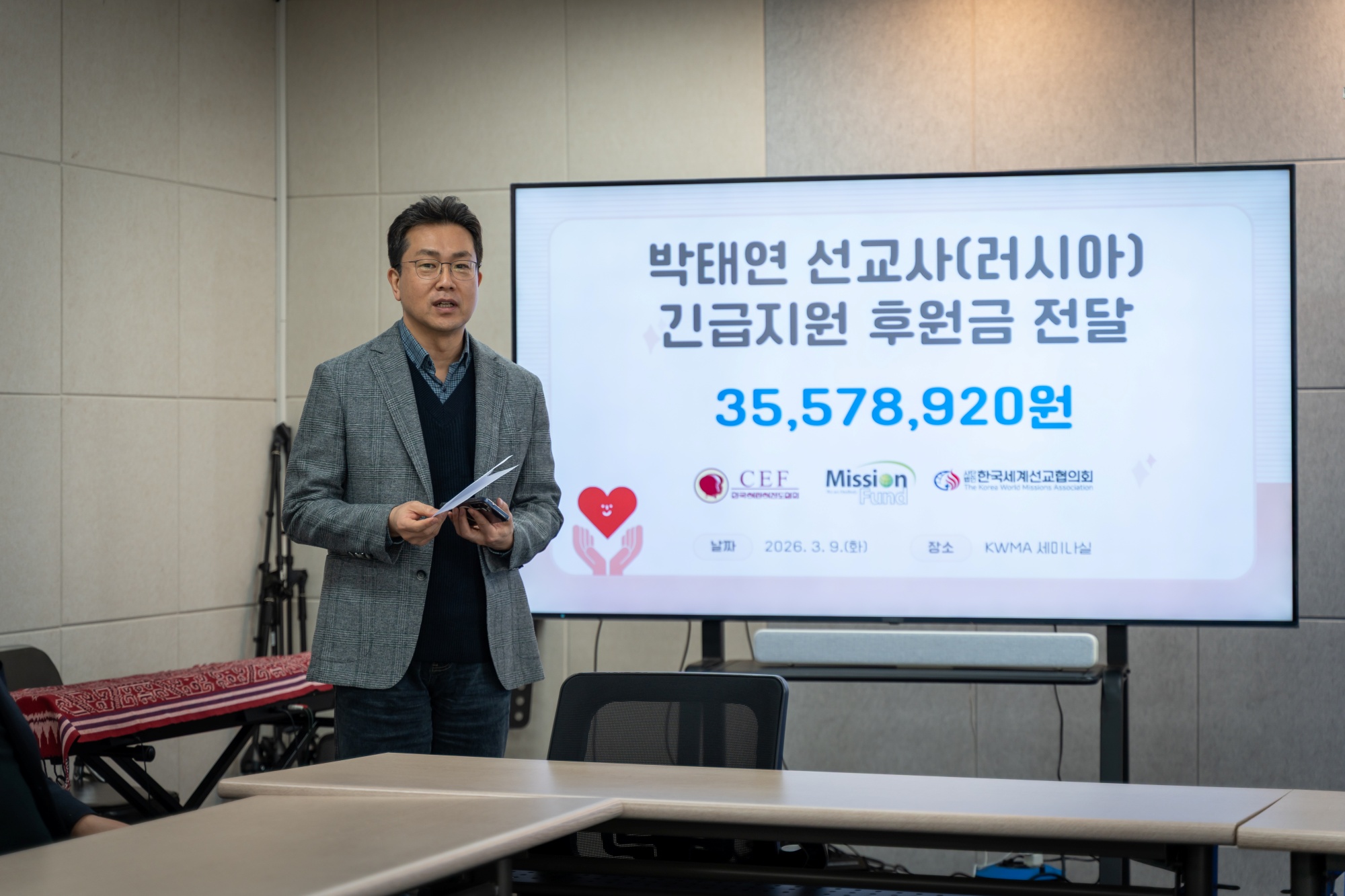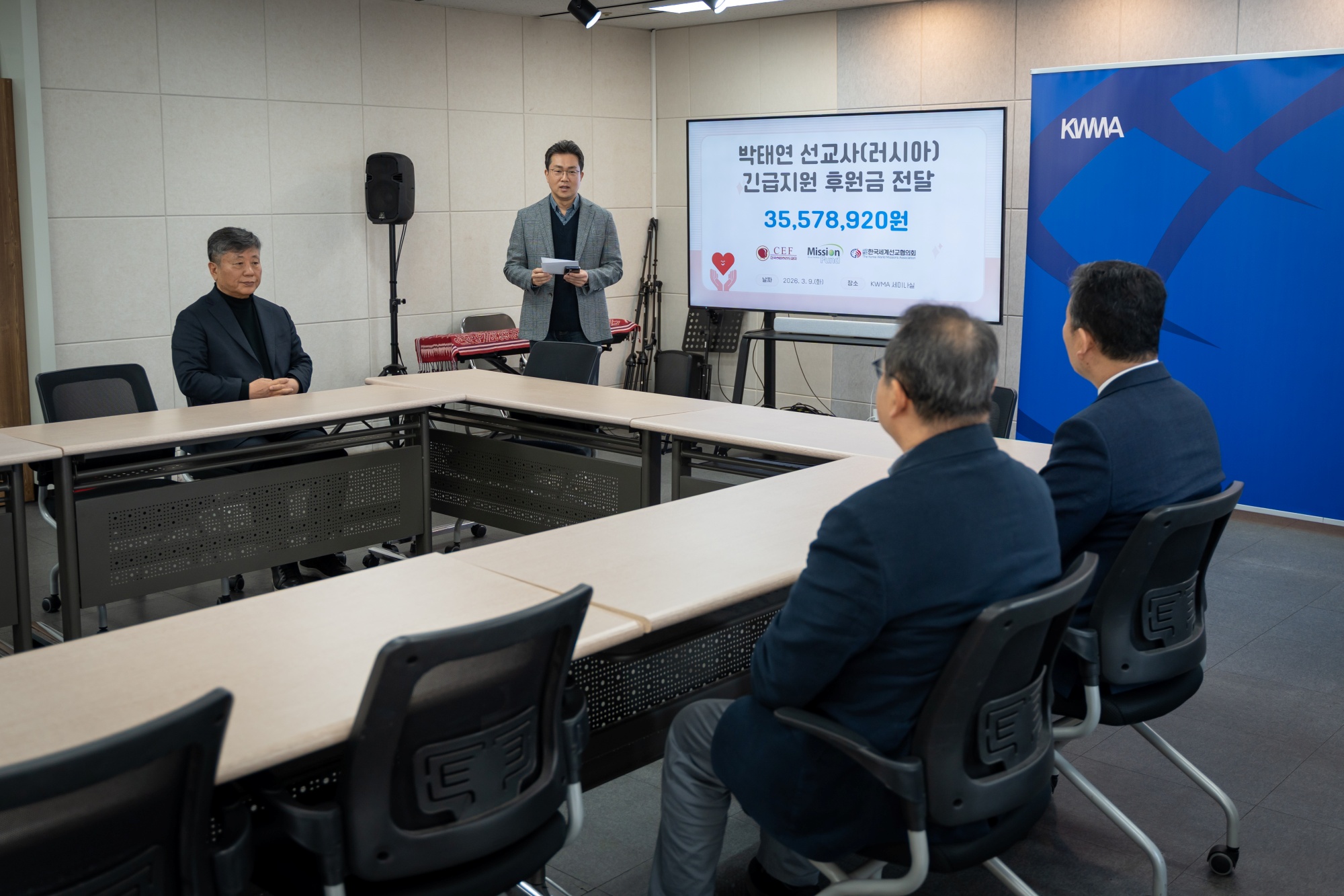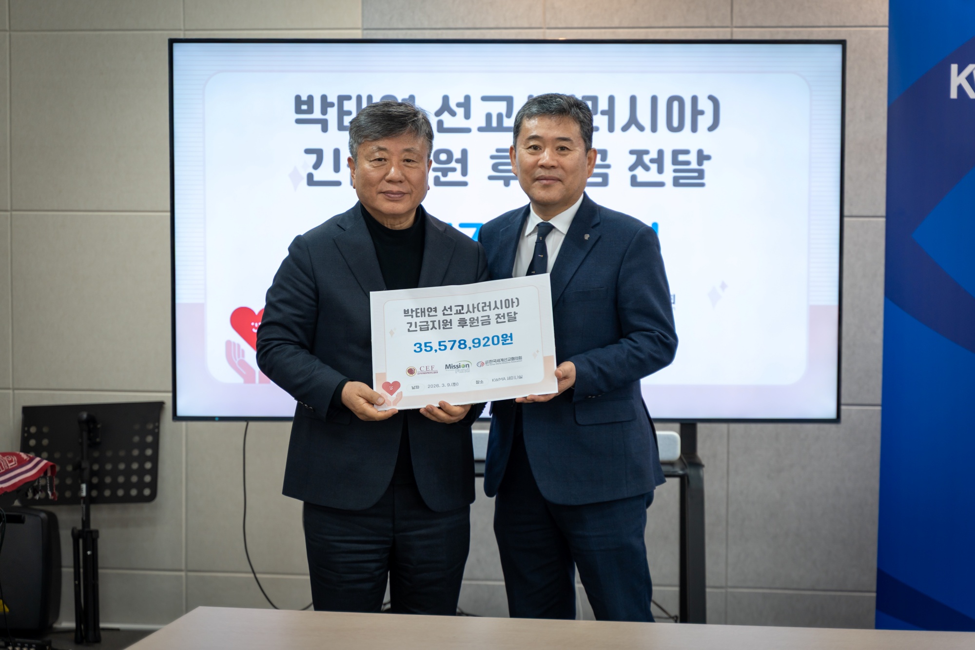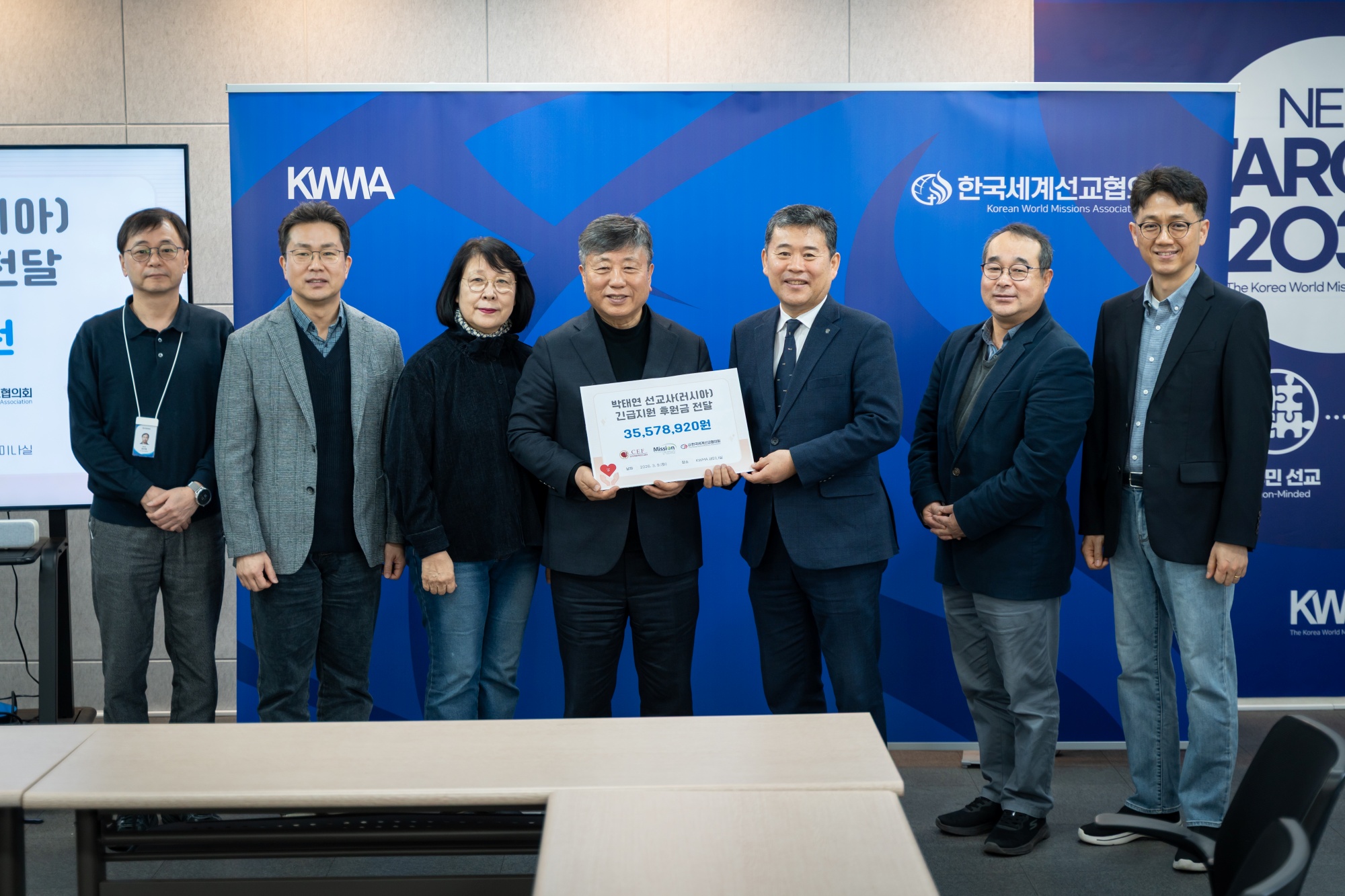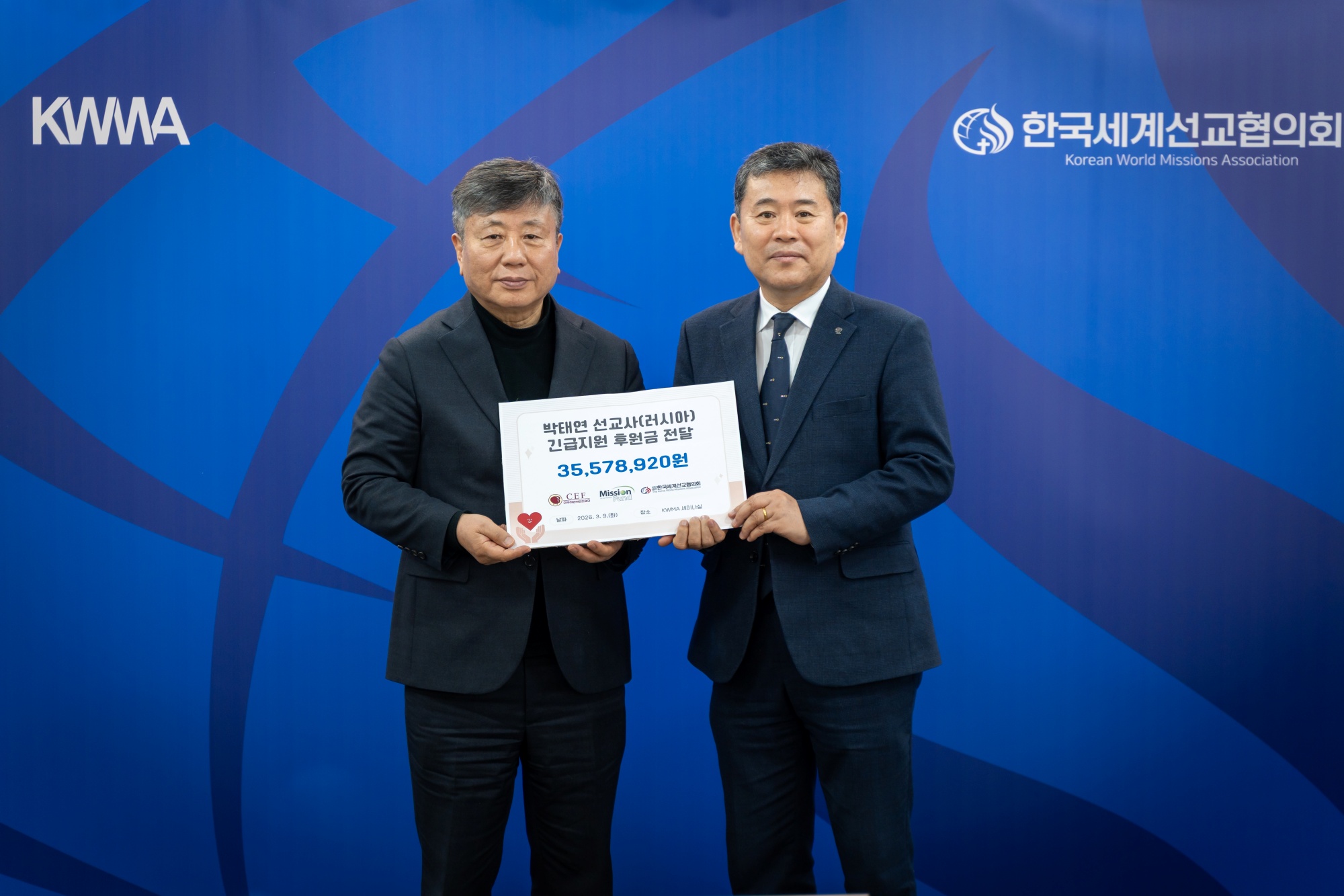(사)한국세계선교협의회(KWMA)는 3월 10일(화) 오전 10시, KWMA 세미나실에서 러시아 박태연 선교사(한국어린이전도협회 파송)의 석방을 위한 '긴급지원 후원금 전달식'을 가졌습니다. 이번 후원금은 지난 2월 러시아 현지에서 구금된 박태연 선교사의 석방과 법적 대응을 돕기 위해 한국어린이전도협회(CEF), 미션펀드, KWMA가 공동모금한 결실입니다. 이날 전달식에는 어린이전도협회 한국 대표 박홍선 목사와 해외사역부 부장 이정환 목사, 그리고 KWMA 강대흥 사무총장 등이 참석하였습니다. 미션펀드를 통해 전국 교회와 성도들이 보내주신 총 35,578,920원의 후원금은 KWMA를 통해 한국어린이전도협회에 전액 전달되었으며, 박 선교사의 변호사 선임 및 긴급 구호 비용으로 사용될 예정입니다. 박홍선 목사(한국어린이전도협회 대표)는 “공동모금에 힘을 보태준 KWMA와 미션펀드, 그리고 성도님들께 감사드립니다. 박태연 선교사가 33년 선교 헌신 끝에 마주한 이 시련을 믿음으로 이겨내고 속히 귀국할 수 있도록 계속 기도해 달라”고 전했습니다. 강대흥 사무총장은 “은퇴를 앞둔 선교사님의 고난에 하나님의 간섭과 은혜가 절실하다”며, “하나님께서 현지 법원과 관계자들의 마음을 움직여 주시고, 변호사에게 지혜를 주셔서 박 선교사님이 조속히 자유를 얻을 수 있도록 함께 기도하자”고 당부하였습니다.